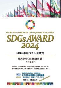 この度、株式会社ゴールドハーストは一般社団法人 国連 P.R.I.D.E 日本(太平洋地域発展及び教育組織)様より、SDGs推進ベスト企業賞を受賞いたしました。