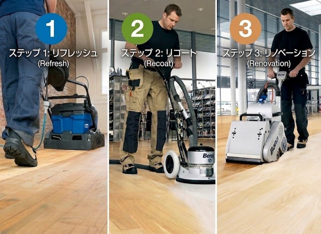 GOLDHURSTは、スウェーデン発祥のBona社(創業1919年・フローリング塗料で世界No.1)の システムを全面採用した、3段階のフロアメンテナンスプログラムを提供しています。