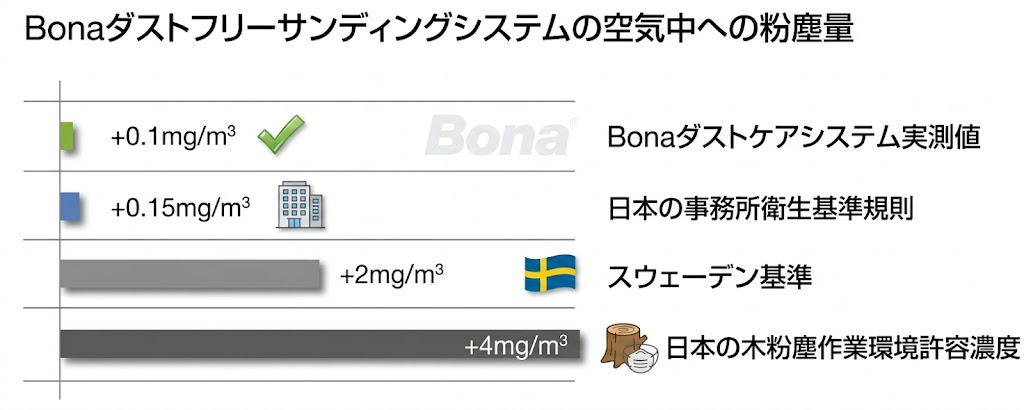 日本の事務所衛生基準規則の値すら下回る水準です。 これが「実質粉塵ゼロ(ダストフリー)」と呼ばれる理由です。
